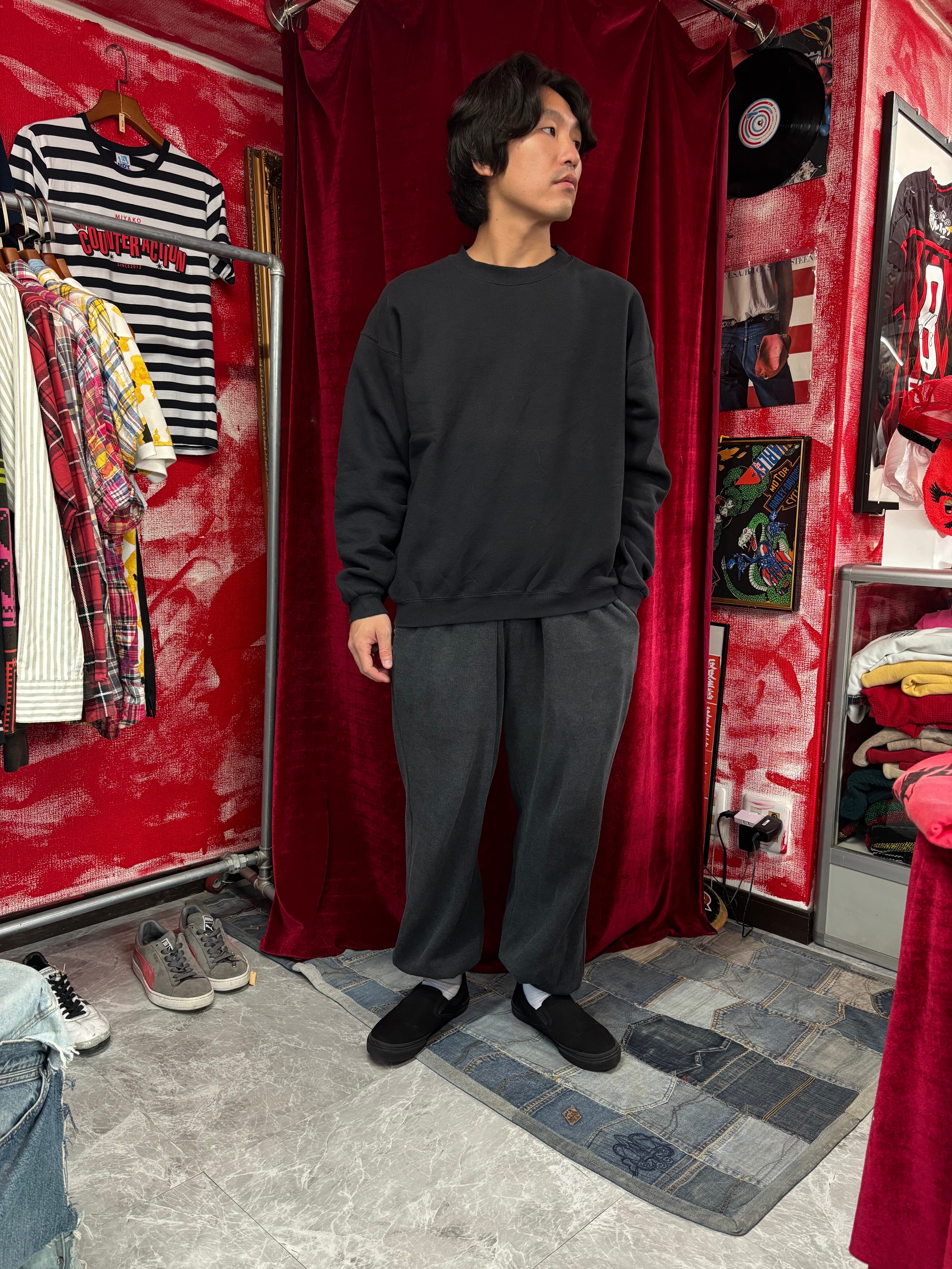 ブラックの無地スウェ
