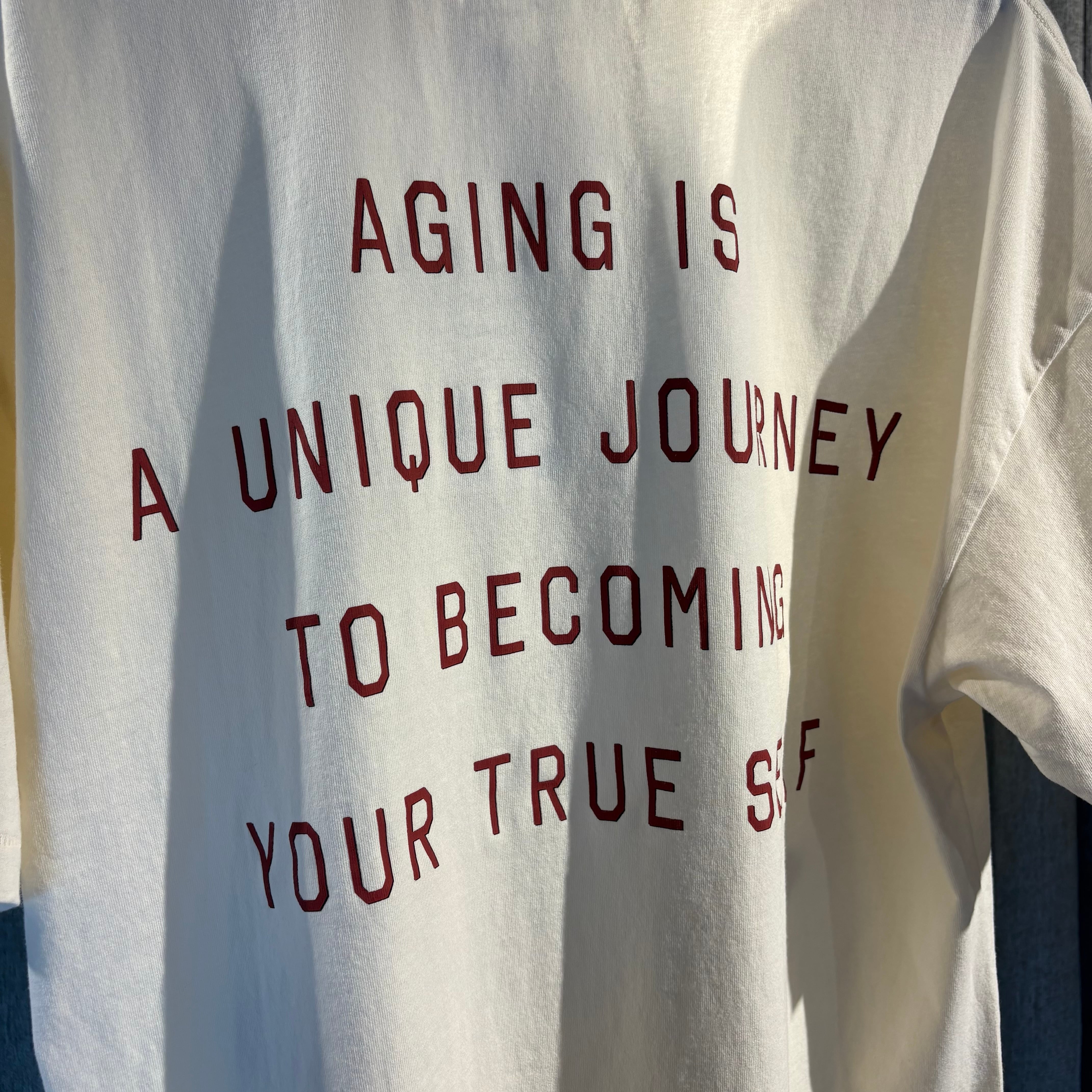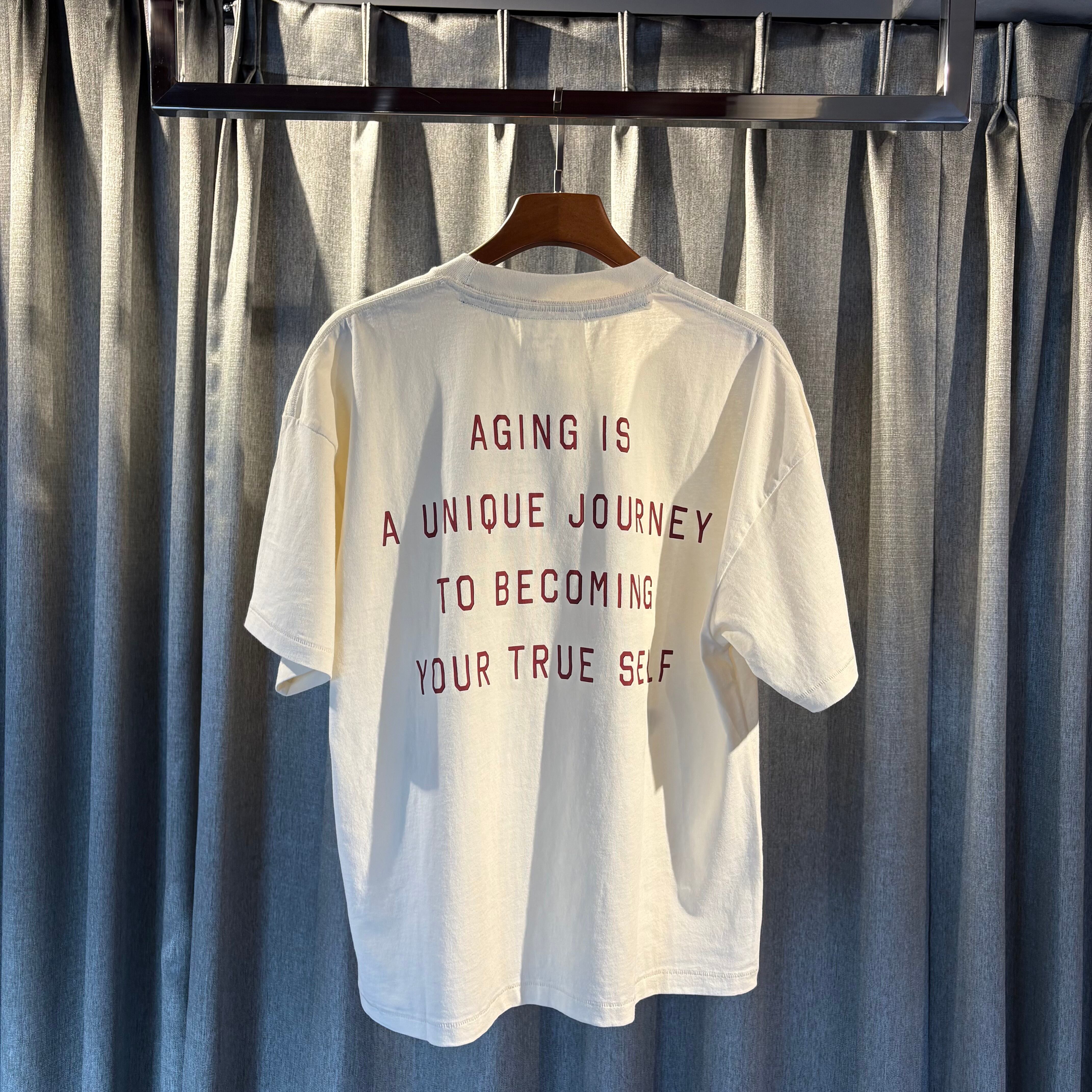 背面には「AGING IS A UNIQUE JOURNEY TO BECOMING YOUR TRUE SELF」のメッセージをプリント。